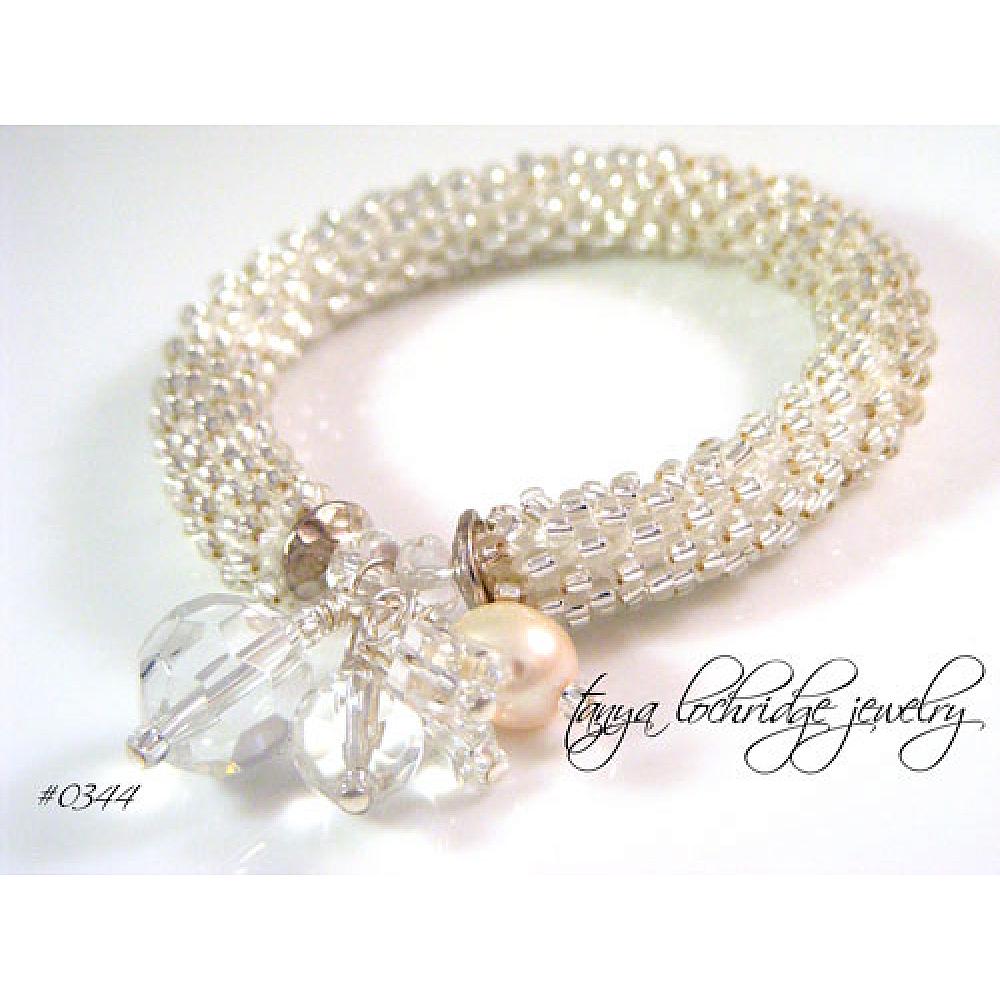 The rope, which is made from the smallest glass beads, measures about 3/8” in diameter and the five wirewrapped dangling charms include a big (14mm) fancy cut Czech glass bead, an 8mm Czech glass bead, Swarovski crystal clear cubes and, sigh, a lovely freshwater pearl. The unique soft bangle design of this bracelet means that you simply (and carefully) roll it over your hand and onto your wrist. Hammered top-quality silver-plate bead caps. Fits a medium-sized wrist. Handmade in the USA using domestic and imported components. From the Tanya Lochridge Jewelry Trunk Show Collection. From wedding ceremony to honeymoon -- with the click of a charm, or two or three.