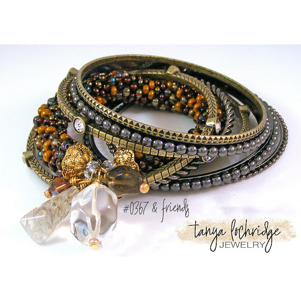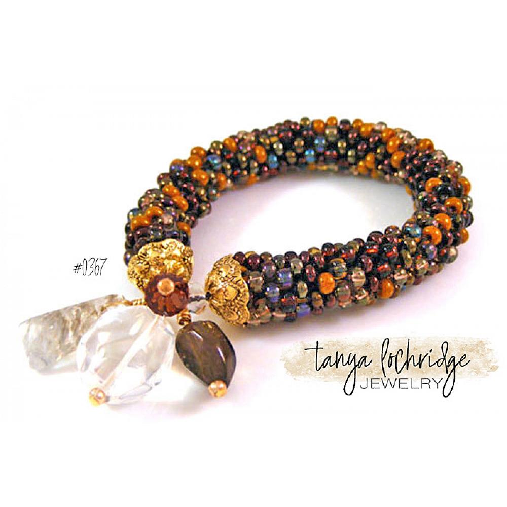 It’s a chocolate lover’s dream. A mixture of Czech glass milk, semi, and deep dark chocolate beads make up the “rope” bracelet which measures a tad more than ½ inch in diameter. Dangling from vintage-inspired antiqued gold bead caps are three members of the quartz gemstone family – rutilated, smoky and crystal. A Swarovski smoke topaz crystal and a mocha Czech glass pearl join in to finish the look beautifully. All wire-wrapped by hand. (And, trust me, I have the hands to prove it!) Fits an average size wrist and the unique soft bangle design lets you just roll it on – no clasps to slow you down.