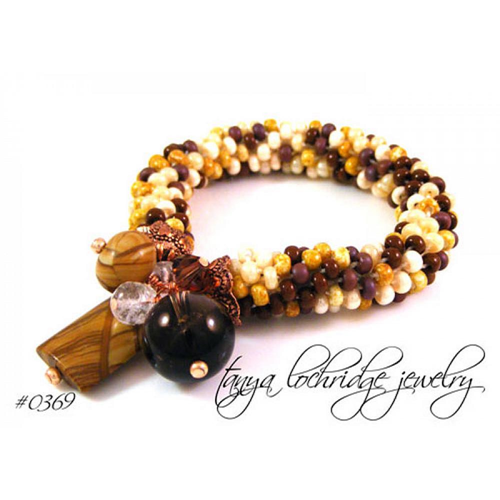 More of my “lucky” stone – it’s a long story; but in a nutshell, it was a piece of rainbow hickoryite that connected me with someone I know in the jewe;ru industry; it all sounds very mysterious, but fun. In this design, two different sizes, shapes and finishes of rainbow hickoryite gemstone come together with a smoky quartz gemstone gumball, cracked crystal quartz gemstone and a pop of Swarovski crystal. The soft bangle rope of the bracelet is made up of the softest natural colors – cream, latte, mocha, and a warm dark brown. Many of the tiny beads have a Picasso finish to them – giving depth and dimension. Amazing what can be done in the Czech Republic with glass and forming tiny little beads. Copper vintage-inspired bead caps warm up the look giving the metal an almost rose gold feel.