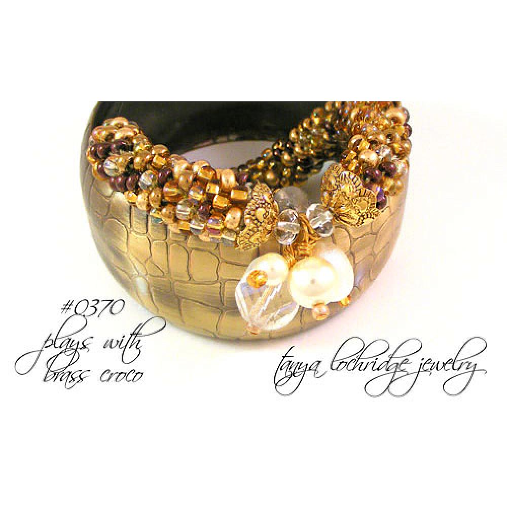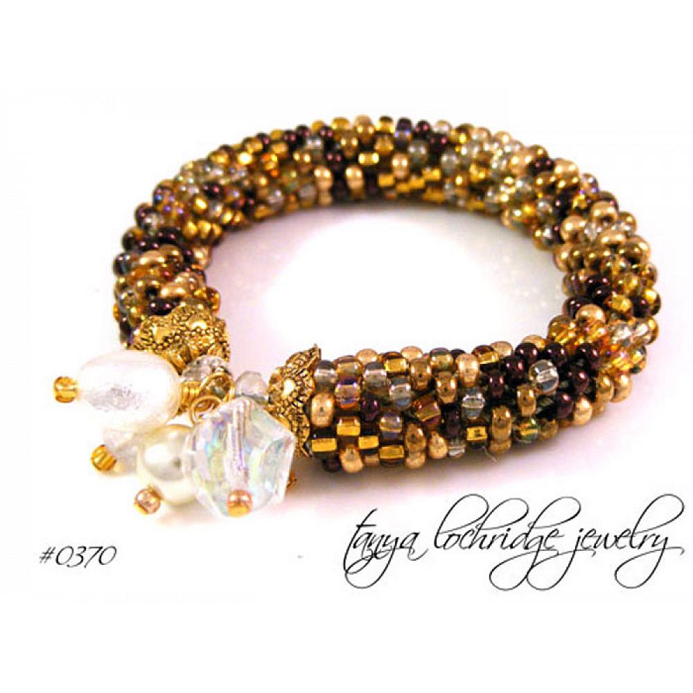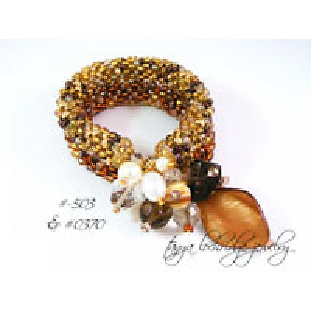 Can something bold make a quiet statement? When I first got this bushel of Czech glass beads (and yes, I do get them in mega mass quantities) I couldn’t wait to whip a rope-like soft bangle bracelet up to see how they looked once in “order.” Well, needless to say, there was no disappointment on my part. Gold beads in matte and silver-lined glitter dance around the rope, mixing it up with deeper gold, warm browns and a few ivory relatives. I love how the finishes of the beads play off each other. Finished with vintage-inspired antique gold bead caps, Czech glass textured and smooth pearls join with Czech Jablonex fancy cut faceted clear beads and one perfectly perfect cracked quartz gemstone work their “charm.” Look closely at the bead caps and you'll see the tiniest of hearts.