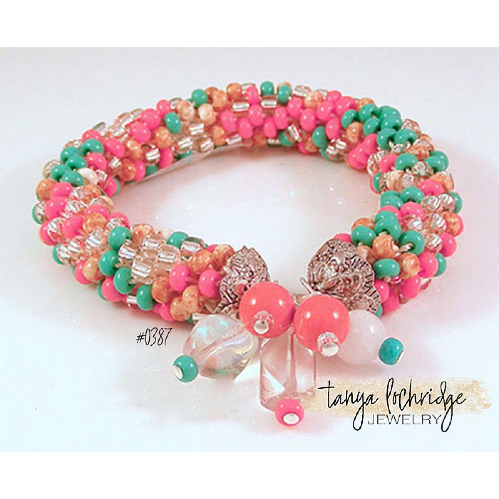 Oh so pretty – coral, turquoise with a smattering of silver. Says “summer” to me; actually it says “wear me all the time!” As you know by now, I just love these bead rope soft bangle design bracelets. Several reasons for my love, I suppose. First, the technique I use to make them is inspired by the women in Nepal – they are well-known for doing this style of craftsmanship. Second, I was inspired many years ago on a little stroll through Bergdorf’s jewelry department when I saw a world-class designer selling similar styles for not so similar prices! And, third I love the fact that they are designed to roll right over your hand and on to the wrist. No clasp – no need to ask that cute guy in the elevator to help you with your bracelet. Hm-m-m maybe that’s a drawback? You be the judge. Anyhow, faceted crystal quartz gemstones, Swarovski glass pearls, and snow quartz gemstones all dangle charm-like from the rope made from the finest Jablonex Czech glass beads. It's your friendship bracelet all grown up and way more sophisticated!