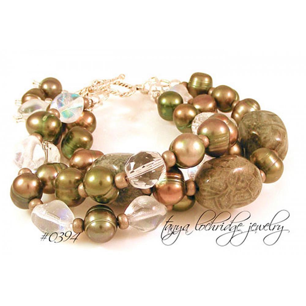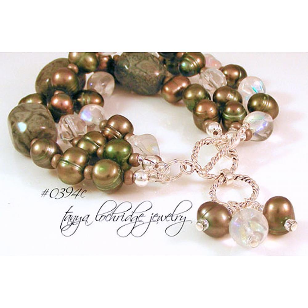 I bought these stones as green mist jasper on a Tucson Gem Show scouting adventure. Under the glass in the studio the rockhound in me finds them very interesting – they have the rolling ball look that you find in rhyolite not so much in jasper. Lovely, really lovely. (Did I just quote Bridget Jones?) I partnered them with green baroque ringed freshwater pearls, with just enough personality and as an interesting contrast to the jasper, I think. And to spark it all, I added Czech Jablonex glass in a baroque nugget shape and a highly faceted and very glittery round bead. You know me…I love the unexpected…in jewelry, that is! The gemstone nuggets measure about 10mm x 15mm and are polished and softly faceted. The glass beads and freshwater pearls are about 10mm in size. Substantial but not over-the-top and the bracelet feels magnificient on the wrist. Closing with an adjustable sterling silver toggle clasp – fits at 7 ½” and 8” so you can get a fit that is just right. Hey, kind of like Goldilocks.