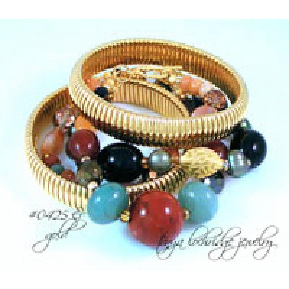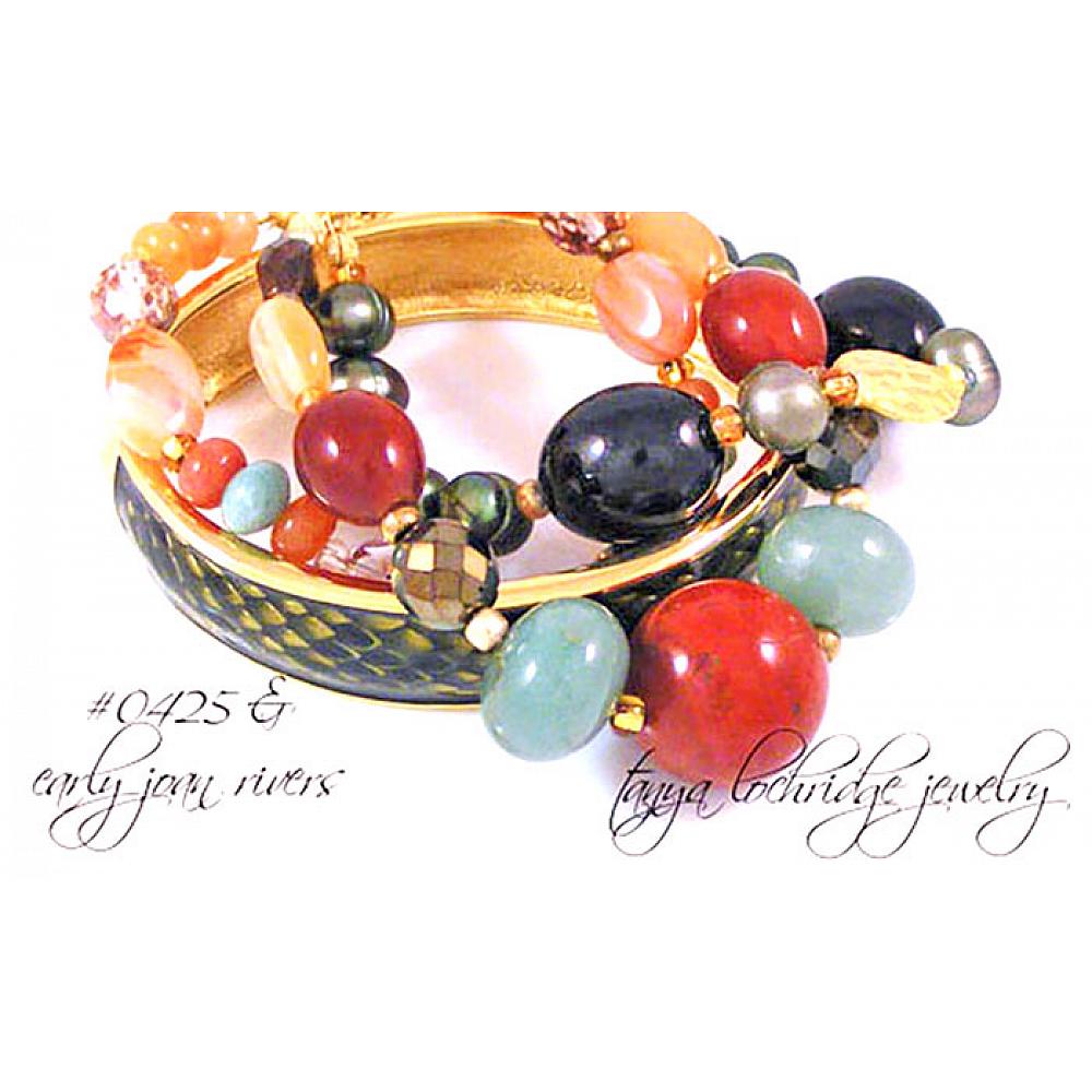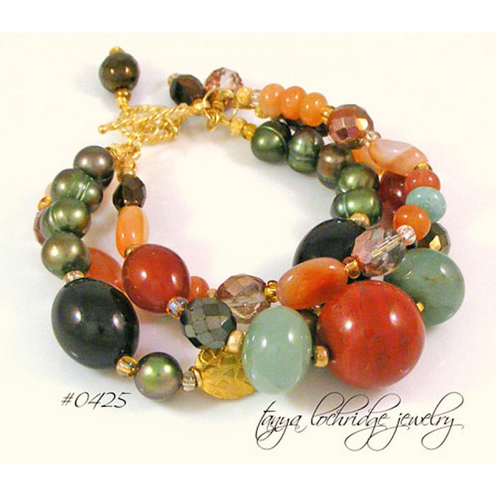 “Stunning!” That’s what you and everyone who sees you will be saying when you were this fabulous three-strand bracelet. Oh how I wish I could be there when you open the package. Here’s an idea – set up your video camera to capture the moment – now that would be fun!! The color combination is by far one of the prettiest I have ever done – yes, I said ever. It starts with a 20mm gobstopper of luscious red poppy jasper, that joins with green aventurine, carnelian, smoky quartz with pops of African opal, amazonite and agate gemstones. Then to add the glitz and glimmer of the sun on a crisp fall day, I’ve incorporated the finest fire-polished Czech Jablonex glass beads in varying shapes, finishes and sizes. Oh did I mention the green baroque ringed freshwater pearls?  I think it is the unexpected nature of the green aventurine that just makes it work for me in a special way.