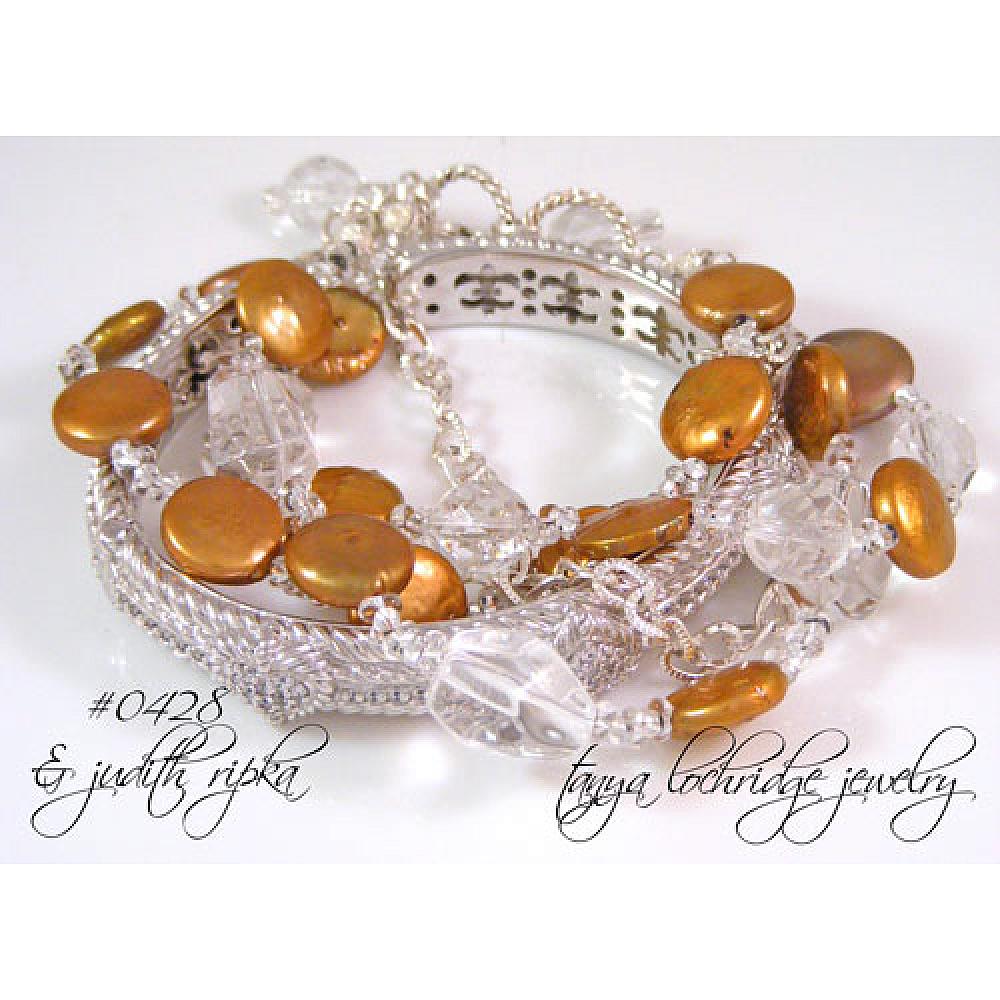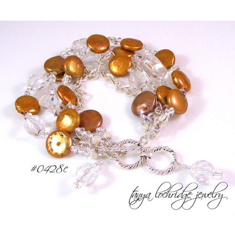 Heavy sigh – that’s what you’ll do when you unwrap your little gift and see this beauty for the first time. The color of the freshwater baroque coin pearls is a cross between mocha and rose – feminine but not too fluffy. While they look very brown in the image, they are a definite mocha-rose color. The pearls measure about 10mm and are a perfect complement for the big clear crystal quartz faceted and polished gemstone nuggets. Think of the crystal quartz nuggets as worry stones – they are so smooth – just rubbing them will take you to another place. Well, at least for a second or two. Teamed with the finest glittery Czech Jablonex fire-polished faceted clear beads and two strands of textured silver-plate chain it all comes together with a sterling silver twisted adjustable toggle clasp.