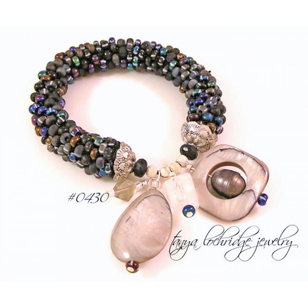 Another one of those designs that look like you discovered it while on vacation at some exotic beachy resort. The rope component of the bracelet measures 1/2” in diameter and closes with top-quality substantial antiqued silver finished bead caps. Look closely, you’ll see the tiniest of hearts bringing love your way. The silver-gray on the two one-inch mother-of-pearl beads is mystical and sparks to life when mixed with the clear crystal quartz nugget and 10mm-11mm grey baroque ringed freshwater pearl. A glint of one of Swarovski’s latest crystal colors is the icing on the cake. Tiny glittering beads continue to light the fire of it all.