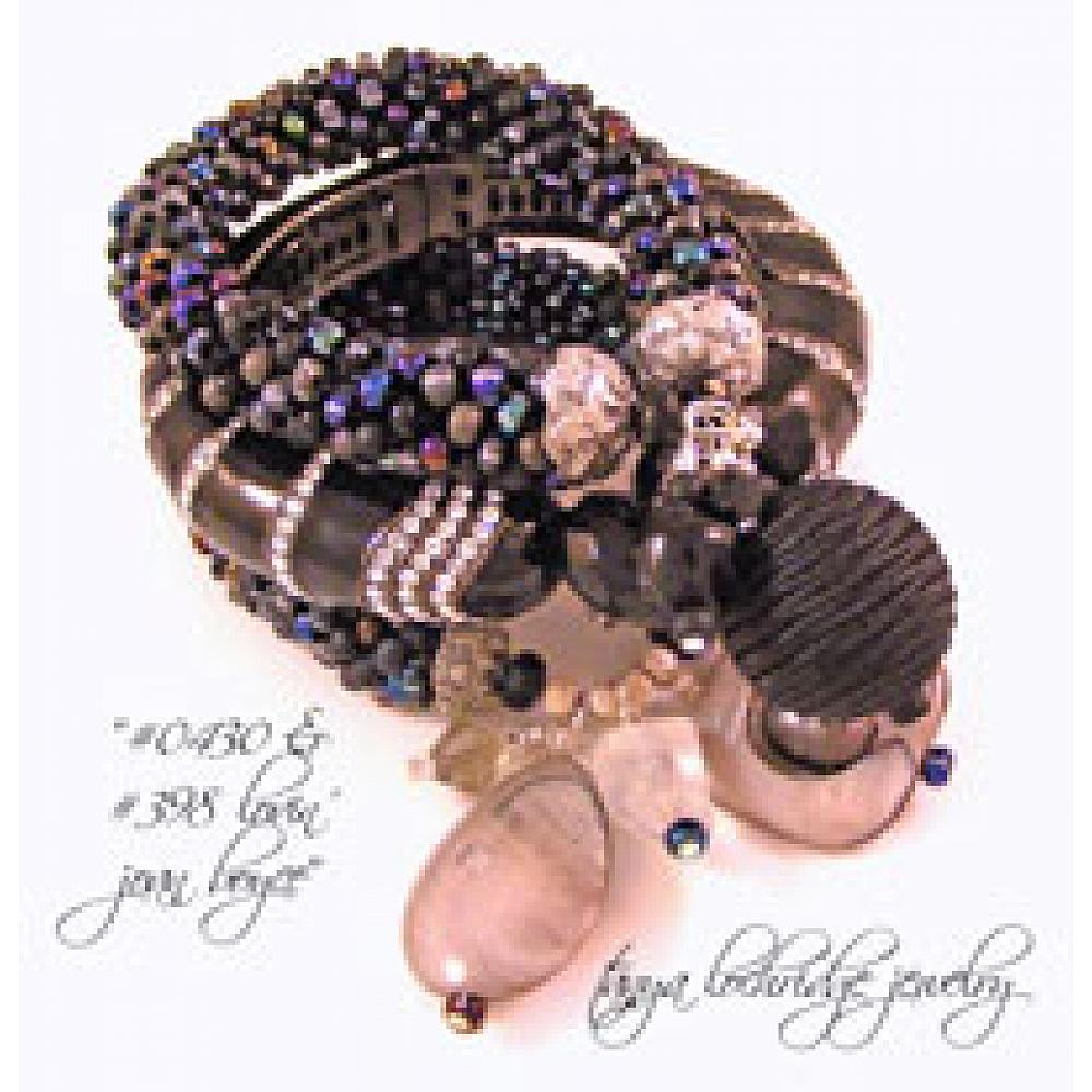 The rope component of the bracelet is made up of Jablonex Czech glass black beads – some matte, some transparent, and others looking like magical hematite. They are a perfect complement to the “charms” that dance from the rope. The unique soft bangle design of this bracelet means that you simply (and carefully) roll it over your hand and onto your wrist. Fits a medium sized wrist. This looks great layered with #0397 – the perfect way to start your collection. I also love these bracelets layered with metal and enamel cuff style bracelets from my jewelry box.