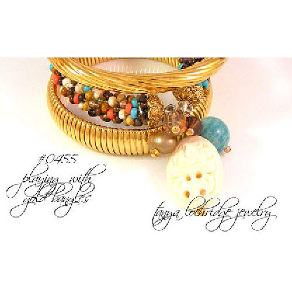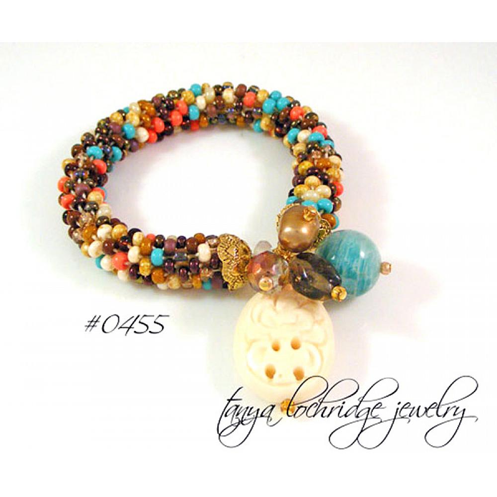 Oh-la-la! So pretty is the overall look of this beauty. The soft bangle rope component of this design is made up of the finest Czech glass beads in turquoise, coral, cream, and smoky topaz all with varying finishes. The rope ends with my signature end caps in top-quality gold-plate pewter -- see the tiny hearts worked into the surface design?