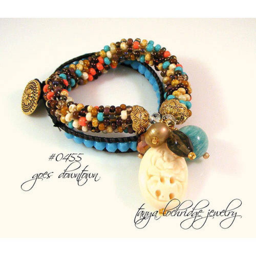 Sized to fit an average wrist. (I also want you to know that there is a good chance the carved bead is of animal origin – not that the animal was hunted for its bone – the bones are a remnant of meat processing. So if you choose not to wear any animal product, then this is not the bracelet for you. But there are plenty others that will suit your fancy including one just like this without the carded floral piece #0455.) Here you can see how I’ve layered it with a cool hip downtown corded bracelet. Fun, no?