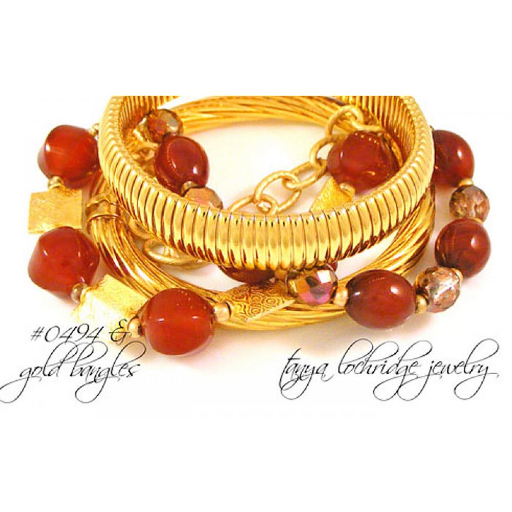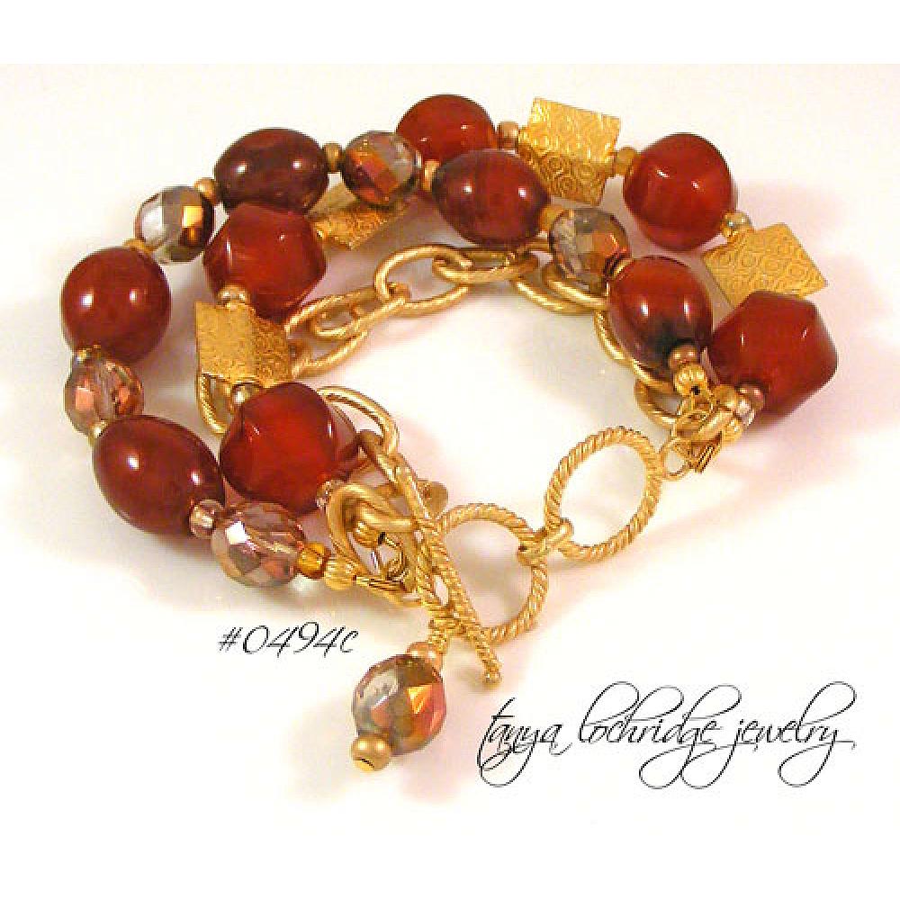 “Old World” – that is my first thought when I look at this bracelet. I love carnelian, perhaps because it has been used in jewelry for hundreds and hundreds of years. In fact, many of the glorious Etruscan pieces I drooled over in the Met in New York City included carnelian in their designs. I love how the gemstone just works with gold – especially the matte Florentine-type finish I used in this particular design. The fire that comes from the spectacular Czech Jablonex glass faceted beads just adds to the intrigue of it all. Three strands give the bracelet a significant presence and they feel so good on the wrist.