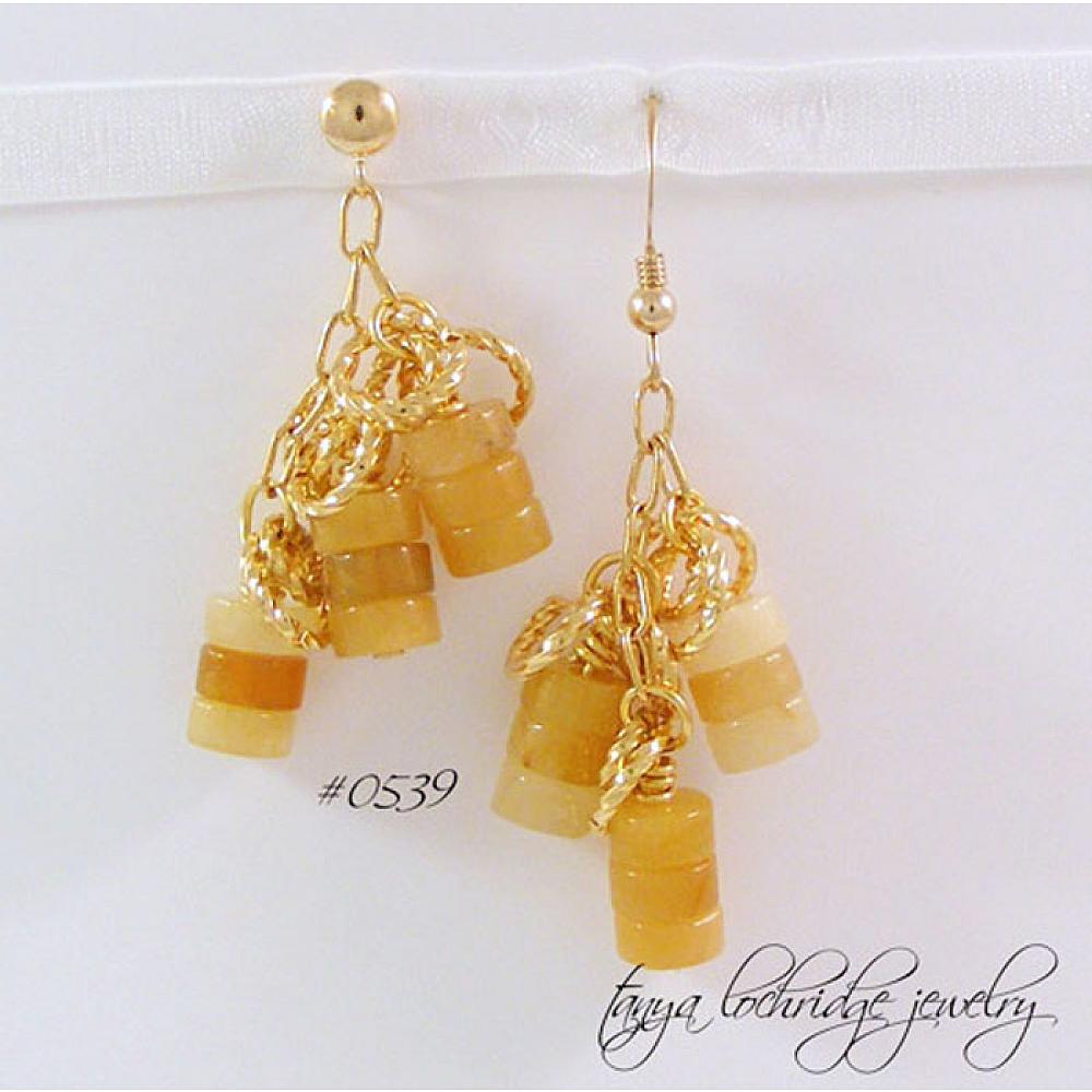 These earrings, in a choice of a gold-fill 4mm saucer post or gold-fill earwire, have a drop of 1 1/4”. (NOTE: SAUCER POST CURRENTLY UNAVAILABLE.) Flashes of twisted rings dance in and out of round and various colored polished gemstone beads. While Pantone named Honey Gold a favorite color for Fall-Winter 2012 – in my mind there is nothing seasonal about these wonderful gems.