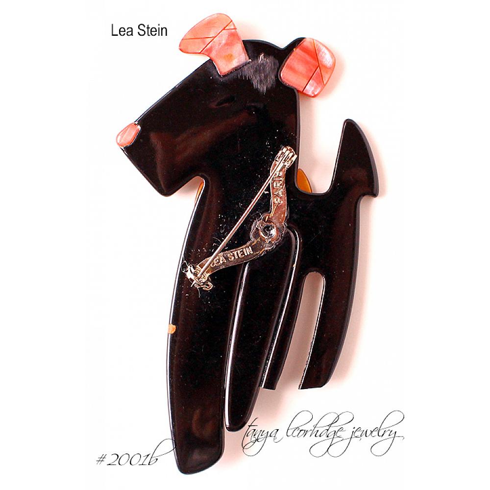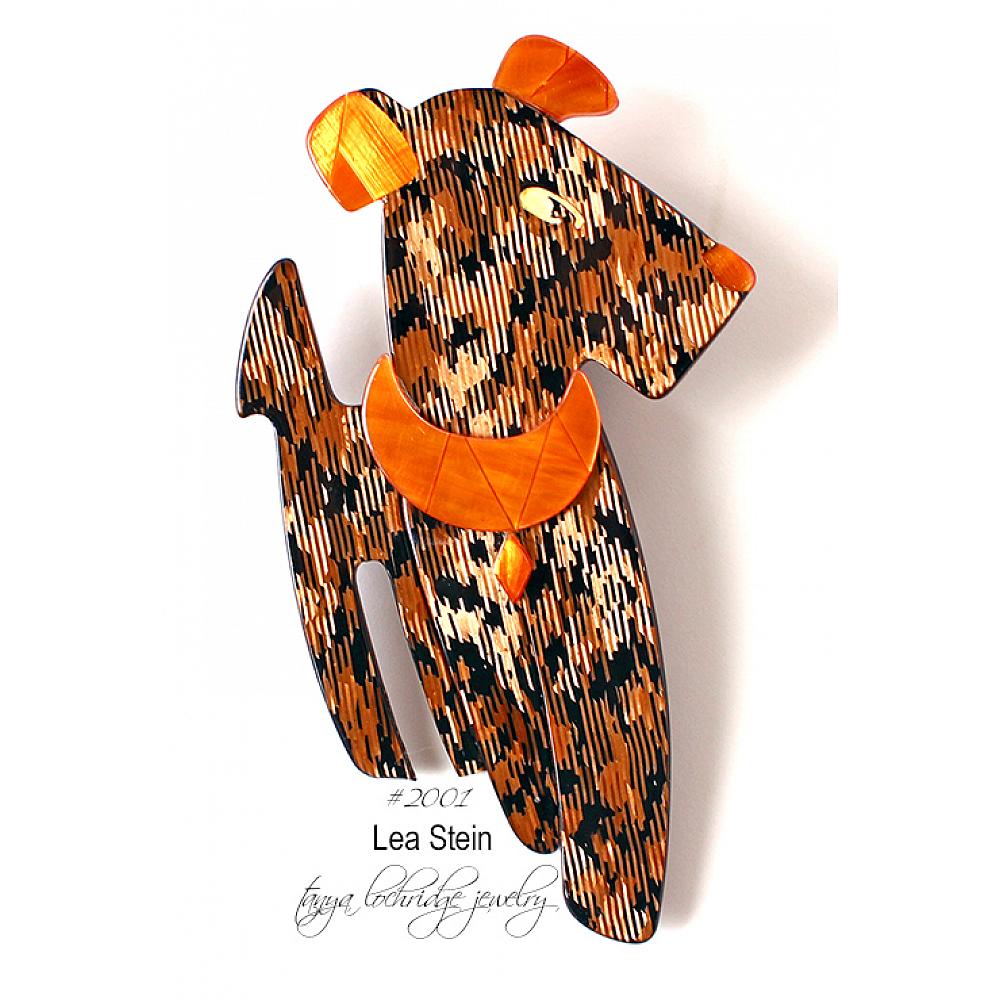 Ric, the Airedale, by Lea Stein Paris is a very collectible guy. In the 60s, Lea and her husband, a chemist, worked together to create a unique laminated cellulose acetate. This material could be layered with varying textures and Lea Stein played with lots o colors, interesting textures and patterns in her layered pieces. Each one is unique.
