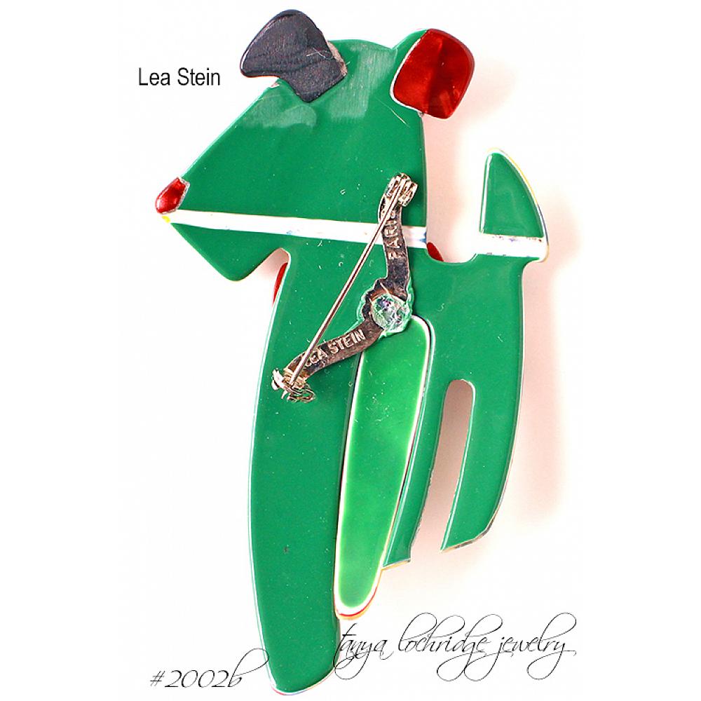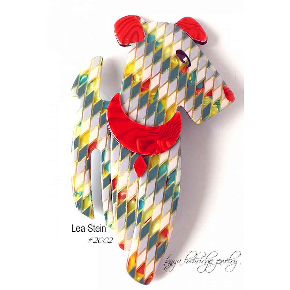 Ric, the Airedale, by Lea Stein Paris is a very collectible guy. In the 60s, Lea and her husband, a chemist, worked together to create a unique laminated cellulose acetate. This material could be layered with varying textures and Lea Stein played with lots o colors, interesting textures and patterns in her layered pieces. Each one is unique.
