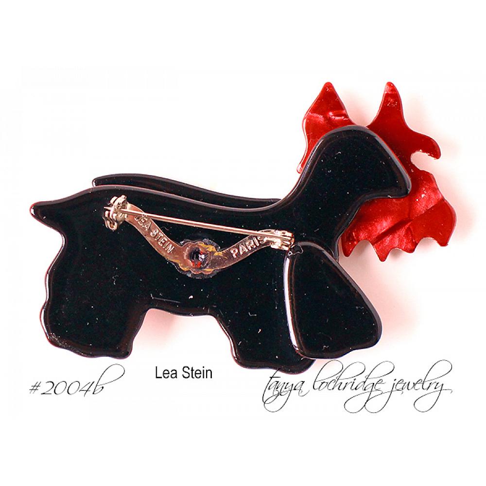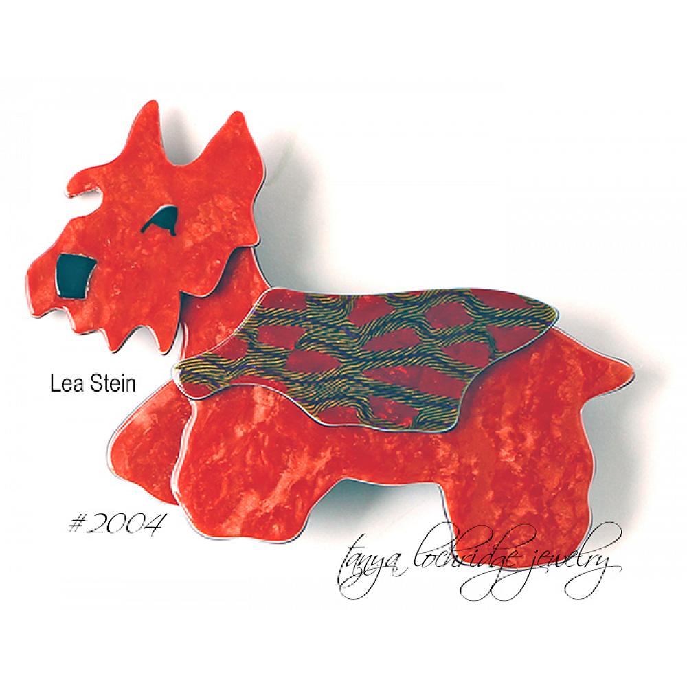 Ric, the Airedale, by Lea Stein Paris is a very collectible guy. In the 60s, Lea and her husband, a chemist, worked together to create a unique laminated cellulose acetate. This material could be layered with varying textures and Lea Stein played with lots o colors, interesting textures and patterns in her layered pieces. Each one is unique.