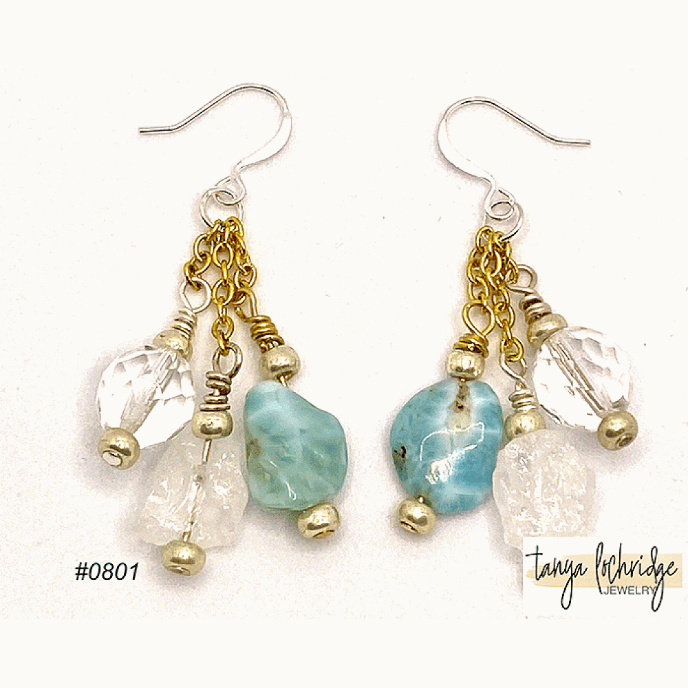Some cute bits and bobs in the way of earrings. Larimar, raw crystal quartz and polished faceted vintage Czech glass beads dance from fine chain and top-quality silver-filled earwires. The larimar and crystal quartz are a natural nugget-shape...close to their "from the ground" state. The larimar is smooth while the crystal quartz has a bit of natural texture to it. Not to worry, it is not rough or scratchy though. The combo of crystals reminds me of flashes of light just below the surface on the waters of the Caribbean. A little something to brighten the day.
