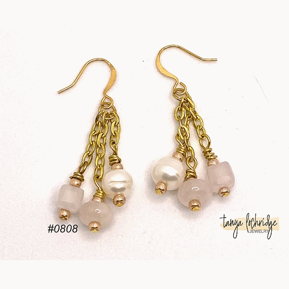 Some cute baubles in the way of earrings. Rose quartz and freshwater pearls sway from fine chain and top-quality gold-filled earwires. I love the cubes and the rondelles tossed together in this look. Because the rose quartz beads are shaped differently, they catch the light in interesting ways. Happy earrings to say the least!