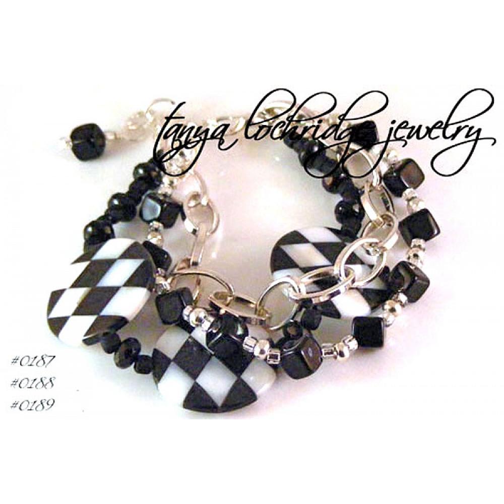 Mother-of-pearl and onyx gemstones make up the deco-inspired 1" round flat beads of this bracelet. Czech glass opaque cube black beads and fire-polished rondelles join with Japanese silver-lined glass beads. High-polished top-quality silver-plate oval chain enhances the overall look. Closing with a lobster style clasp, measure 7 3/4" with a one inch extender giving you fit and wearing options.
