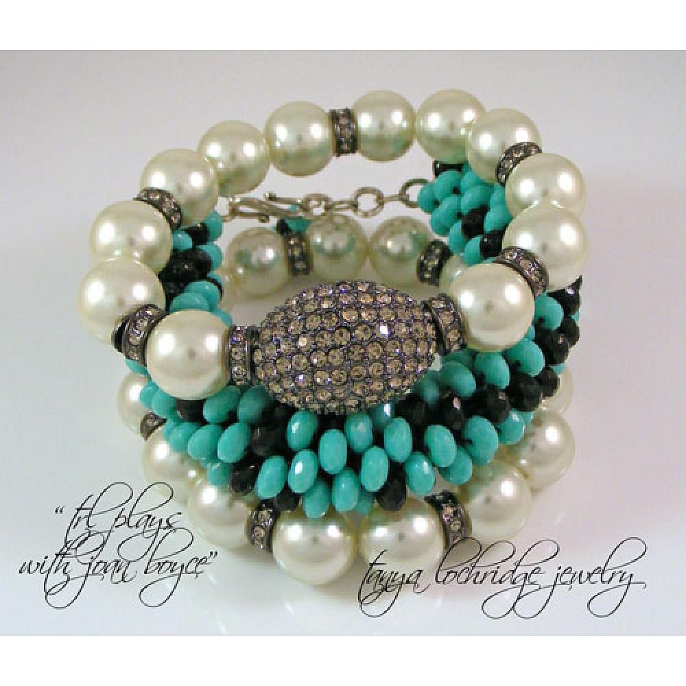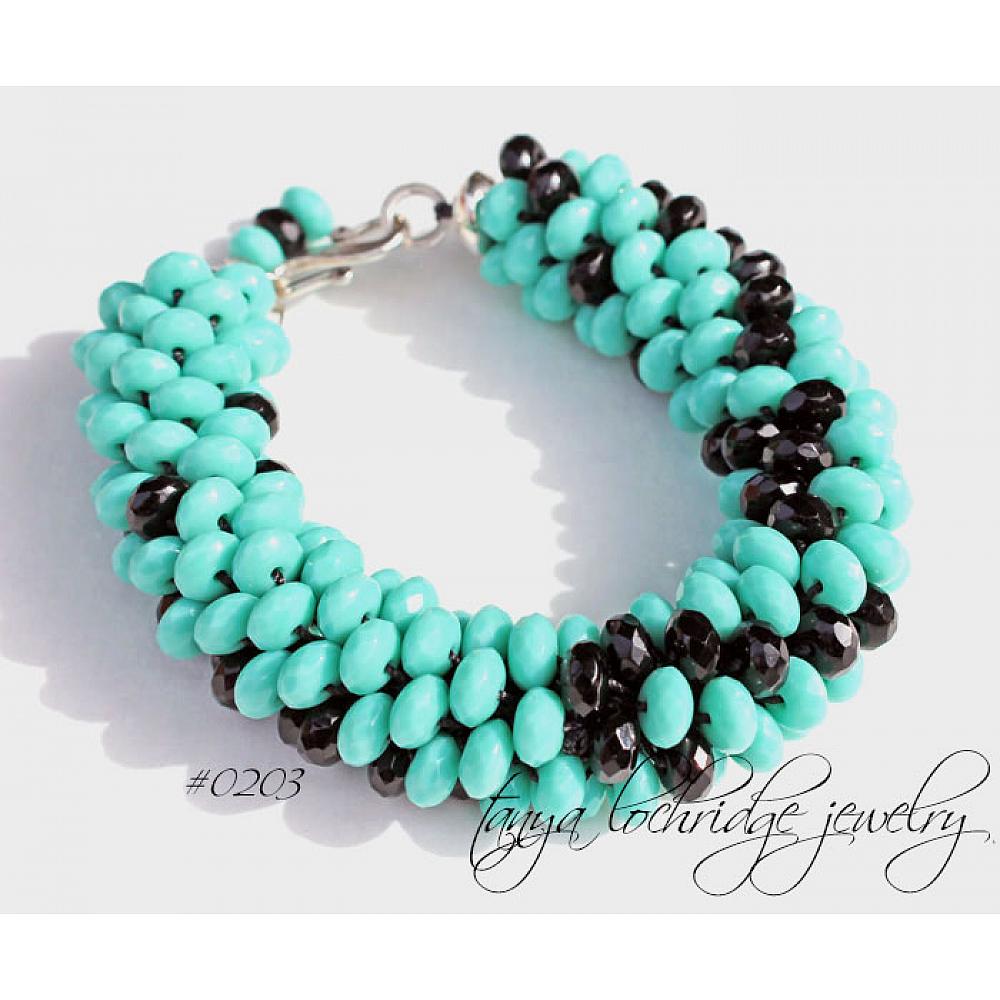 Love, love, love the look of this big bead rope-like bracelet. Its chunky 1/2" diameter stands off your wrist like an oversized soft bangle. Dreamy Czech Jablonex faceted glass beads in opaque turquoise and black -- a bit of art deco meets the 50s; or maybe a bit Mad Men. This style makes for a perfect layering piece when you're in the mood to make a really bold statement.