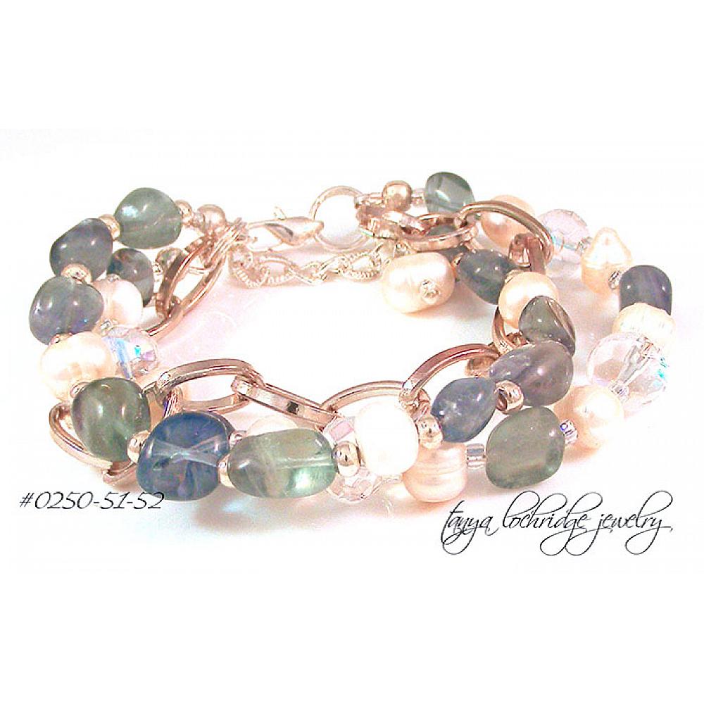 The color of these fluorite baroque-shaped beads (about 12mm in size) reminds me of the beautiful Caribbean Sea in its deepest spots. The baroque freshwater pearls are the perfect complement. My love affair with baroque pearls goes back to 1966 when I was gifted a black baroque natural pearl. It still stays in my treasure chest -- undrilled and unset. Czech faceted Jablonex fire-polished clear beads and the high-polished oval silver-plate link chain complete the overall look. Lobster clasp and extender give fit options -- the length is 8" but it fits a bit smaller. This is what I think of as a smaller look in my line. Don't get me wrong, it is still a bold piece, just not as bold as many others. I love to give you options.