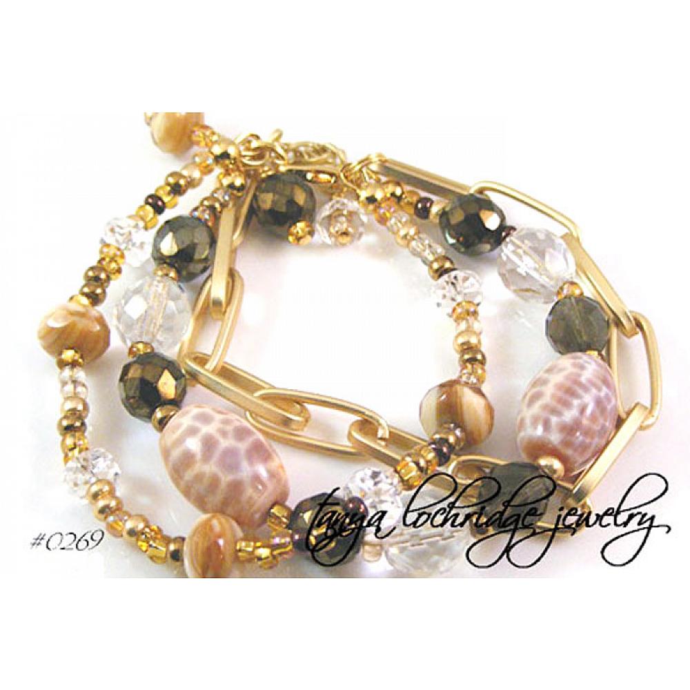 Oh my gosh -- the color of this fire agate is so yummy -- makes me think of English toffee. The mottled appearance looks like a subtle animal print from different angles. Mixed with the glistening brown of the Czech Jablonex fire-polished glass beads and large caramel colored rondelles, it looks good enough to eat -- a toffee and chocolate confection of sorts. Top-quality brushed finish gold-plate link chain brings it all together. Measures 8 1/4" but fits smaller do to the boldness of the fire agate beads (7/8" by 1/2"). Closes with a lobster clasp with 1" extender -- so it should fit just about everyone.
