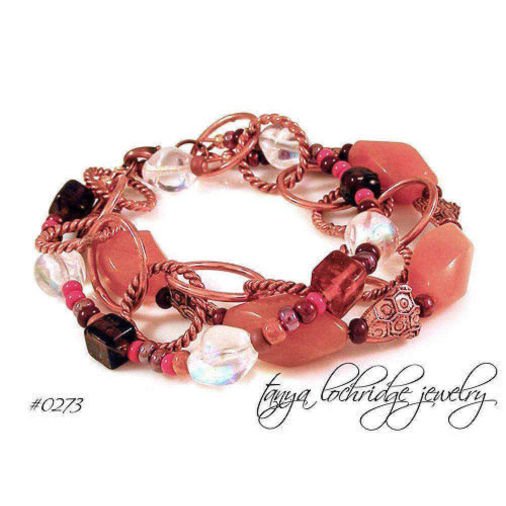 I don't know about the healing properties of copper; but I do know that when I look at this bracelet I feel happy! Not sure if it is the natural red aventurine oval beads or the beautifully detailed copper beads; I just know that mixed with the textured copper round link chain it all comes together and makes a happy statement. Large twisted oval tubes gemstones measure 7/8" by 1/2" and the copper triangular beads are 3/8" long and have significant presence to them. Closes with a lobster clasp and is 8 1/4" in length, but fits like a 7 1/2". Believe it or not, this bracelet can be considered a neutral and will go with most colors in your wardrobe. Okay, so maybe not purple.
