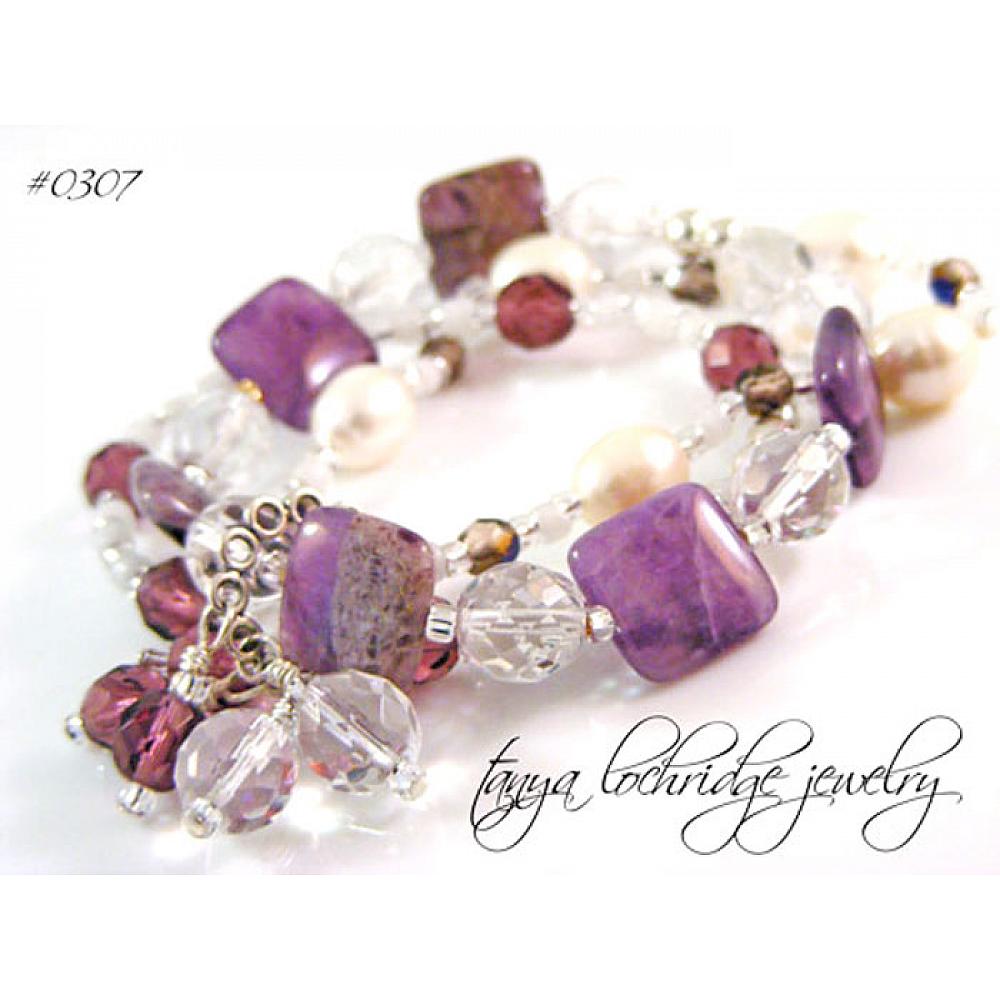 Chevron amethyst is sometimes called "dogtooth amethyst", I know not a very romantic name for this beautiful gemstone, but it is what it is. This form of the gemstone is also called Cape Ameythest since it is only mined in the Cape of South Africa. The large 3/4" puffed pillow beads are translucent in spots, with shots of white and deeper purple throughout. Sparked with the Czech Jablonex fire-polished glass round beads and freshwater baroque pearls it really is a feminine look but in a bold way. "Charms" dangle from a sterling silver ring of rings that pulls the three strands together and gives visual interest as well. This item is a bit larger and fits a medium to larger size wrist.