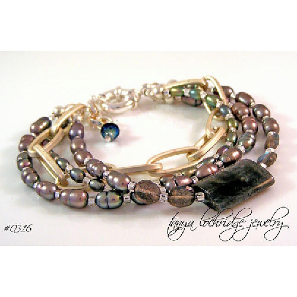 Think Northern Lights or moonbeams dancing off the ocean and you'll understand the magic that is labradorite. It is also what I call the mysterious cousin to moonstone, since both are in the feldspar family. These 3/4" x 1/2" puffy and 5mm x 7mm faceted gemstones are surrounded by freshwater baroque pearls. To me it just feels naturally beautiful and mystical in some way; interesting combination with the brushed finished elongated oval link chain. Closes with the finest quality oversized C-ring clasp, measures 7 1/2" with a 1" extender. So it should work for just about everyone. Made in the USA of domestic and imported components. Would you believe I just saw an $37,000 labradorite bracelet online? Wow! From the Tanya Lochridge Jewelry Trunk Show Collection.