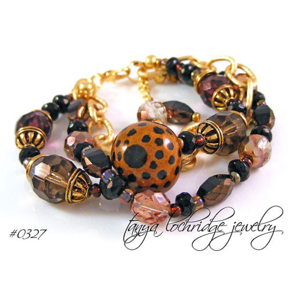 Wow – if you like animal print but not in the over-the-top way, this is the bracelet for you. The Kazuri bead measures ¾” in diameter and is flanked by 12mm, 10mm and 8mm Czech fire-polish faceted rounds and ovals in varying shades of brown. Czech faceted rondelles in black and smaller Czech and Japanese glass beads bring all of the beads together. Don’t ask why, but the antique gold-plate bead caps blend nicely with the Florentine gold-plate finish of the oval rolo link chain. This is certainly a stylish way to wear animal print that’s for sure.